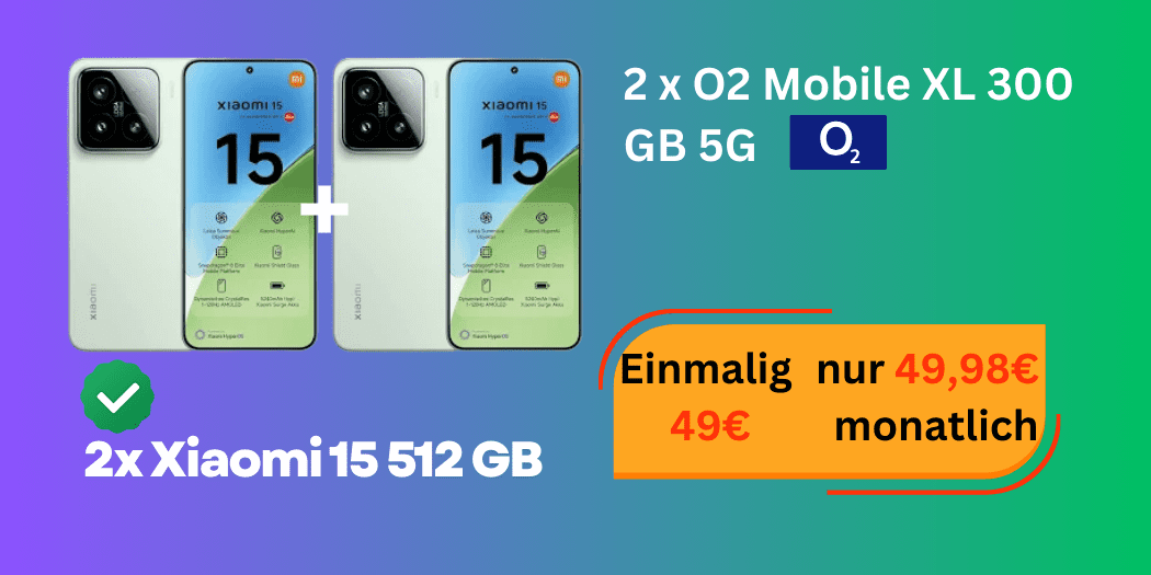Sichere dir 2× Xiaomi 15 (512 GB) mit 2× o2 Mobile XL inkl. 300 GB 5G, Allnet- & SMS-Flat im o2-Netz – smartes Doppel-Bundle für nur 49,98 € mtl. mit starken Vorteilen und EU-Roaming.