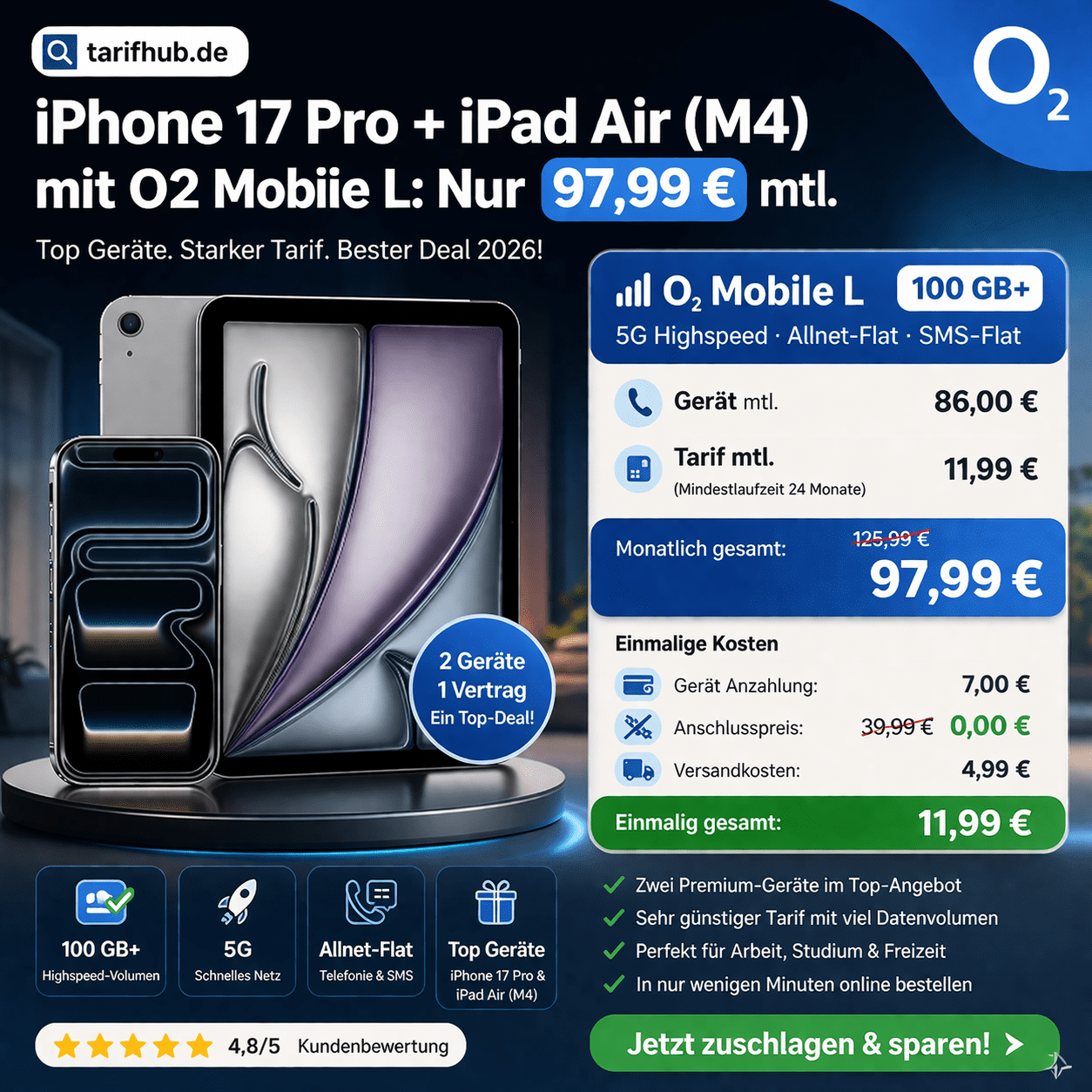 📱 iPhone 17 Pro + iPad Air (M4) mit O2 Mobile L: Nur 97,99 € mtl. – Top Deal 2026?