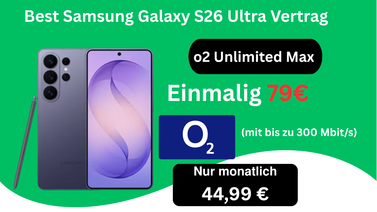Best Samsung Galaxy S26 Ultra Vertrag mit o2 Unlimited 5G ab 44,99€ monatlich: unbegrenztes Datenvolumen, einmalig 79 Euro. Top-Smartphone & starke Preis-Leistung im Vergleich sichern.