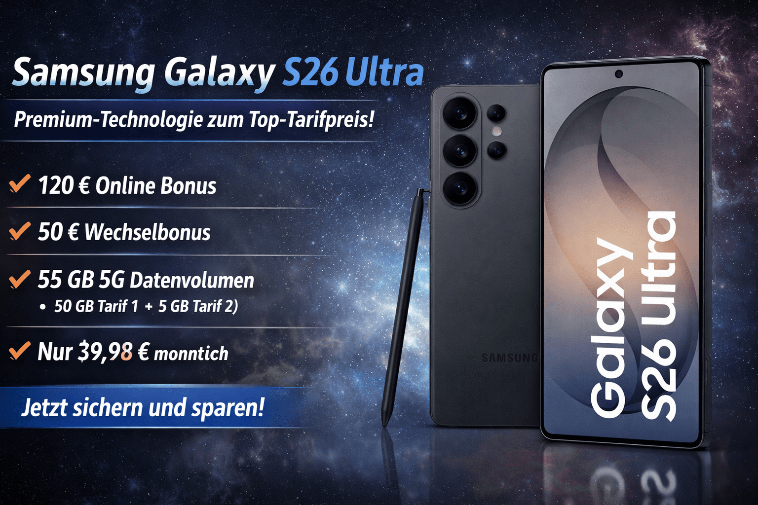 Mit dem neuen Galaxy S26 Ultra erhältst du eines der modernsten Premium-Smartphones auf dem Markt – kombiniert mit einem leistungsstarken 5G-Tarif und attraktiven Bonusaktionen. Dieses Angebot richtet sich an alle, die keine Kompromisse bei Technik, Leistung und Datenvolumen eingehen möchten und gleichzeitig von einem hervorragenden Preis-Leistungs-Verhältnis profitieren wollen.