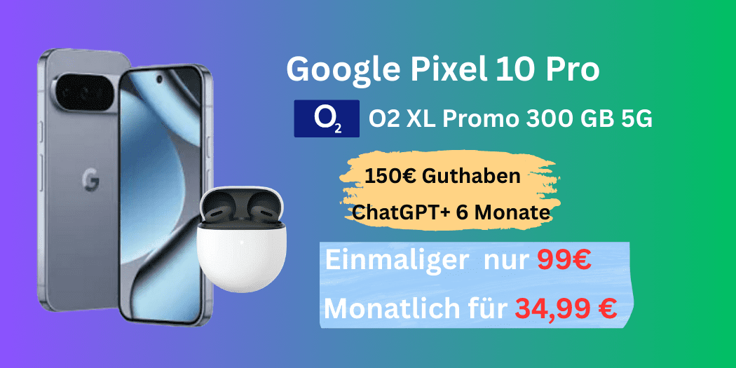 Google Pixel 10 Pro mit o2 300 GB 5G sichern, 150 € Guthaben und nur 34,99 € monatlich, einmaliger Gerätepreis: 99 € und Google Pixel Buds 2A . Jetzt Top-Deal entdecken!