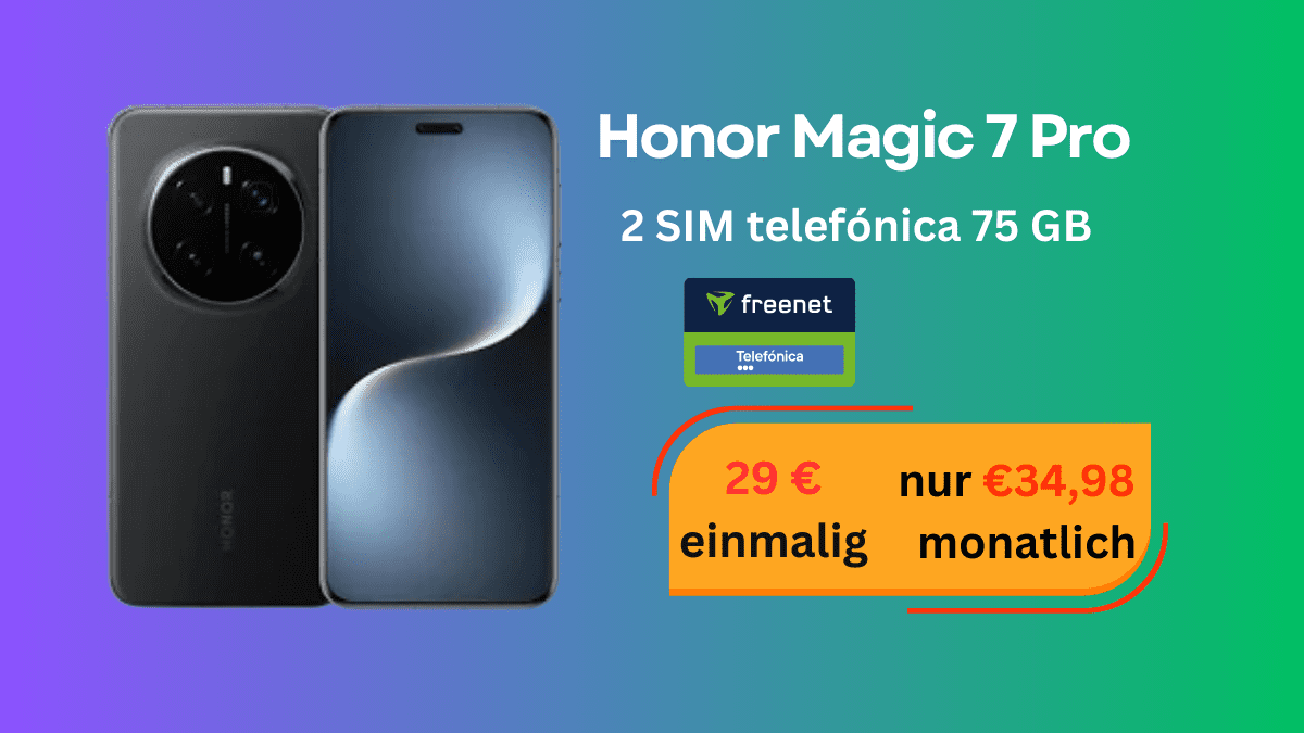 Honor Magic 7 Pro mit 512 GB im Telefónica-Netz mit Allnet-Flat & 75 GB Datenvolumen im MediaMarkt-Tarif sichern. Starkes Flagship-Smartphone mit Snapdragon 8 Elite, 6,8″-Display, 200-MP-Kamera, 5G & Dual-SIM – Top-Deal mit großem Datenpaket. Honor Magic 7 Pro mit 2 SIM telefónica 75 GB für nur 34,98 € monatlich