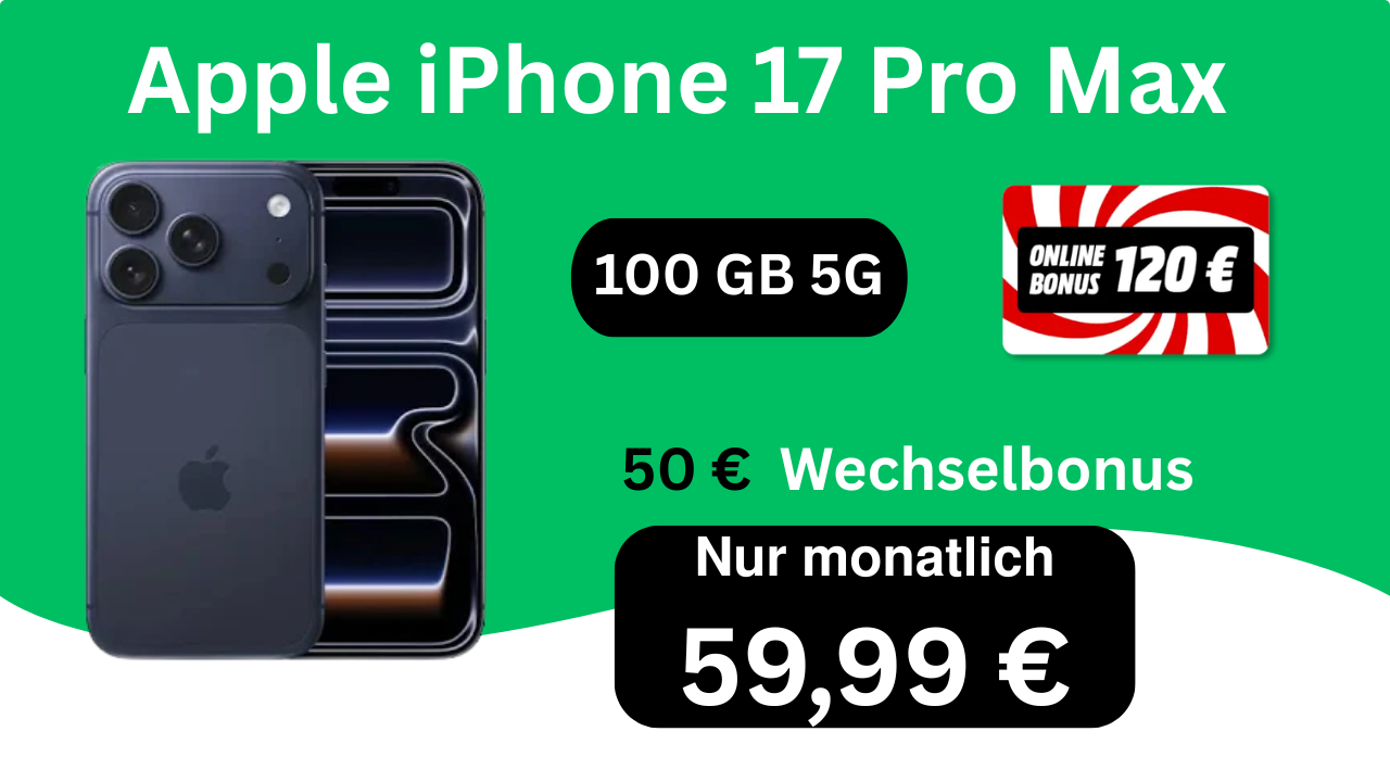 iPhone 17 Pro Max mit 100 GB 5G, 59,95 € mtl., 189,99 € einmalig, 120 € Online-Bonus + 50 € Wechselbonus