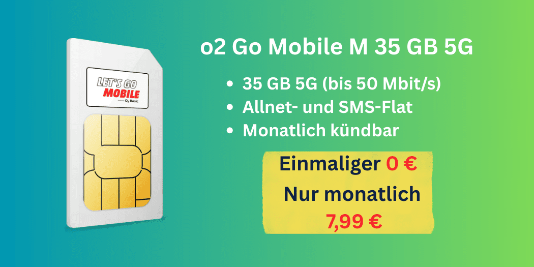 o2 Go Mobile M für nur 7,99 € mtl.: 35 GB 5G, starkes Datenvolumen, 5G im o2-Netz & monatlich kündbar – jetzt günstigen Handytarif sichern!