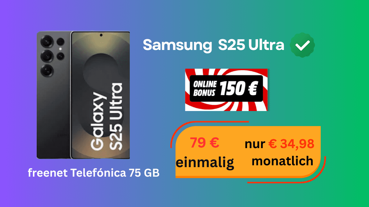 Samsung Galaxy S25 Ultra mit freenet Telefónica 75 GB und 150 € Online-Bonus – jetzt für nur 34,98 € mtl. sichern. High-End-Kamera, ultraschnelles 5G und Top-Preis-Leistung im Premium-Tarif.“