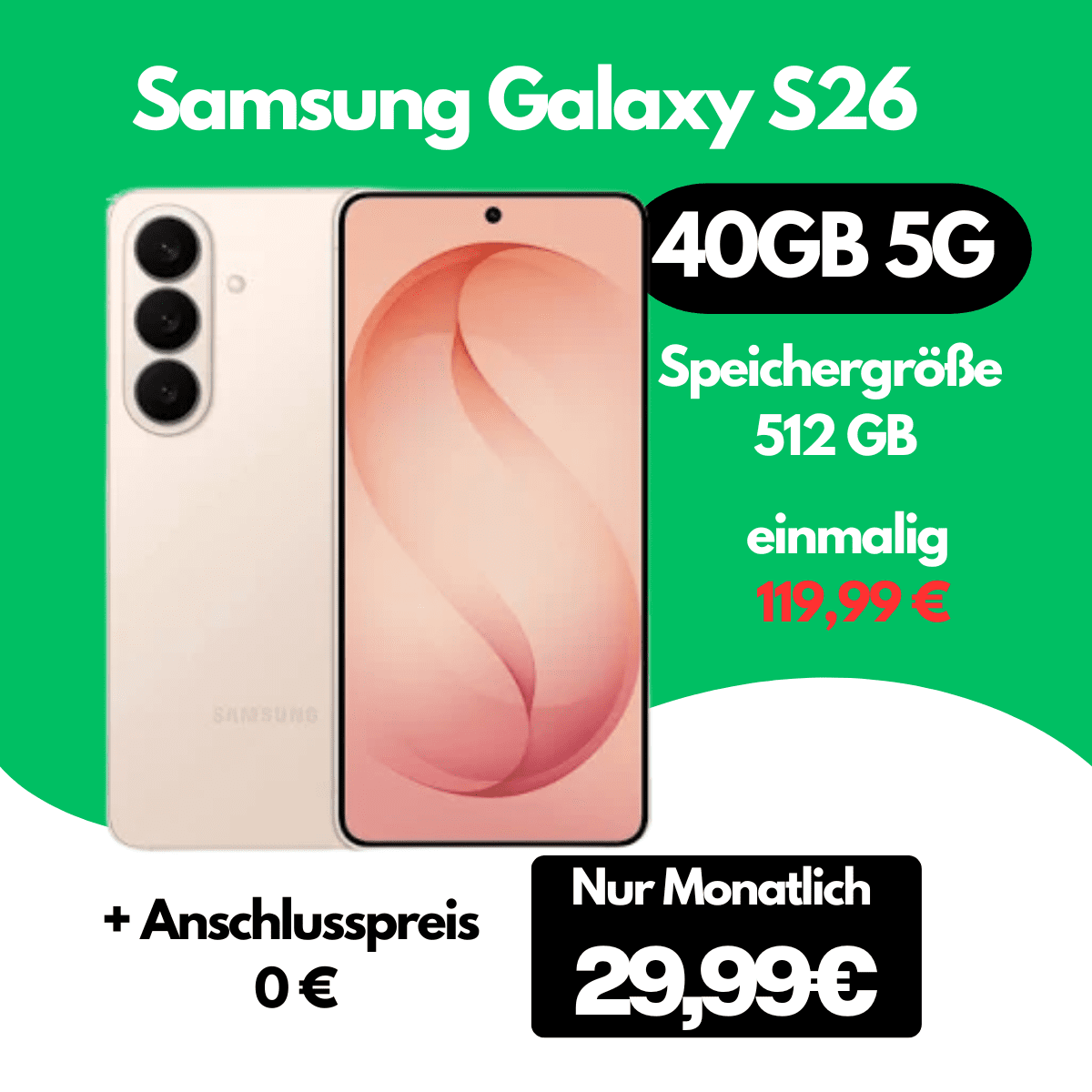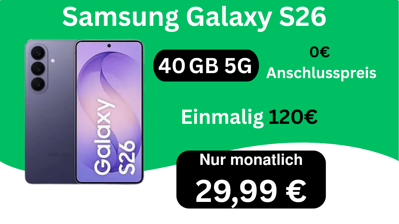 Samsung Galaxy S26+ mit 40 GB Allnet Flat für nur 29,99 € monatlich sichern. Einmalig 119,99 € fürs Handy, 0 € Anschlusspreis. Inklusive Telefon- & SMS-Flat sowie schnellem LTE/5G – starkes Preis-Leistungs-Angebot!