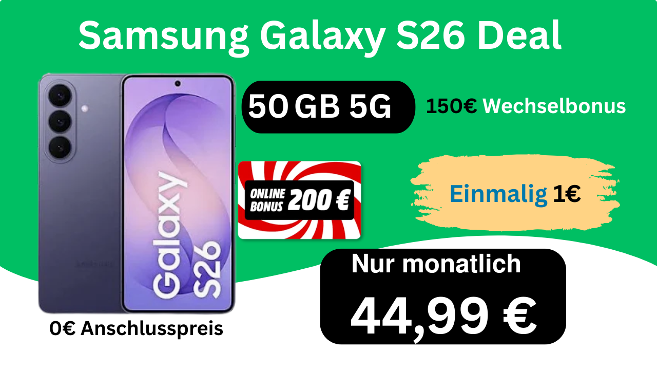 Samsung Galaxy S26 Deal mit 50 GB 5G + 200€ Online-Bonus + 150€ Wechselbonus – 0€ Anschlusspreis, nur 44,99 €/Monat + 1€ einmalig