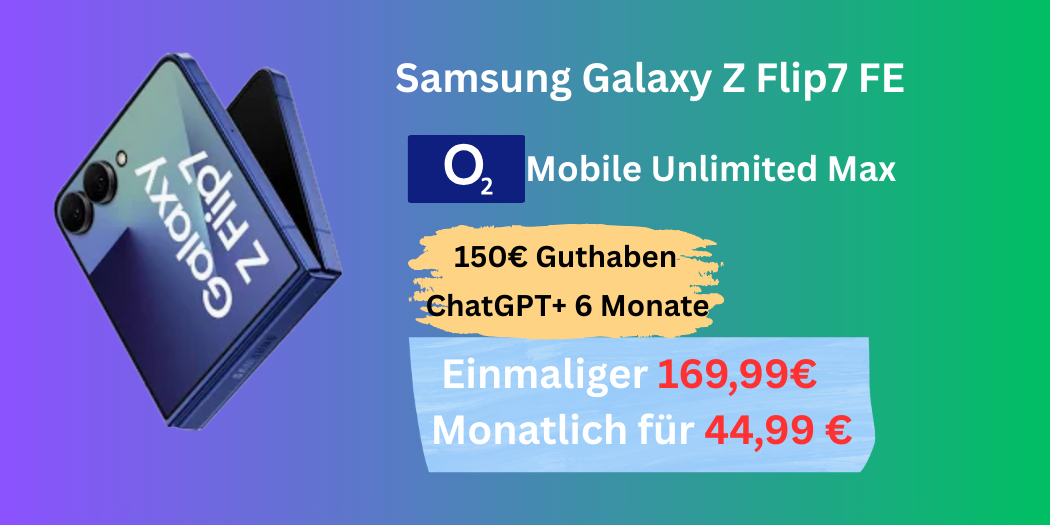 Samsung Galaxy Z Flip7 FE im Bundle mit o2 Mobile Unlimited Max für 44,99 € mtl. und einmaliger Gerätepreis 169,99 €: unbegrenztes 5G-Datenvolumen, Allnet- & SMS-Flat sowie 150 € Guthaben – jetzt Top-Deal sichern!