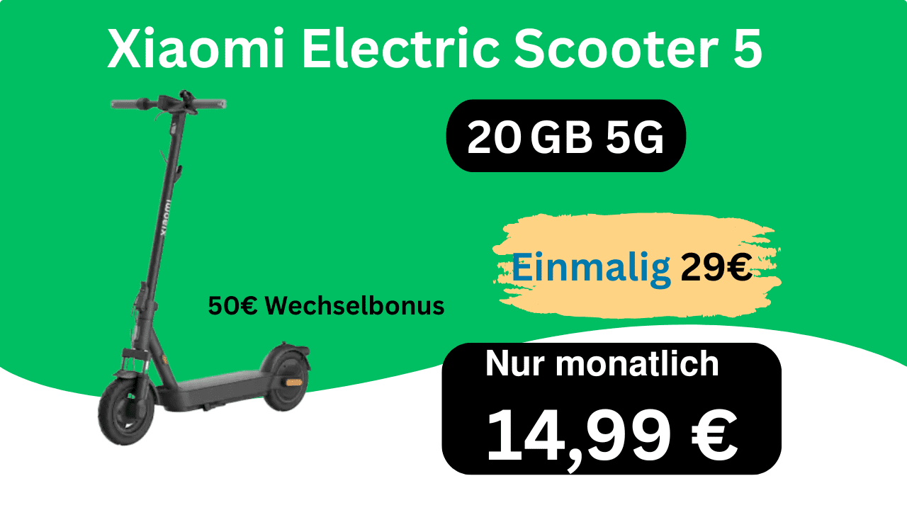 - du sowieso neuen Vertrag braXiaomi Electric Scooter 5 mit 20 GB 5G Tarif – nur 29 € einmalig + 14,99 €/Monat